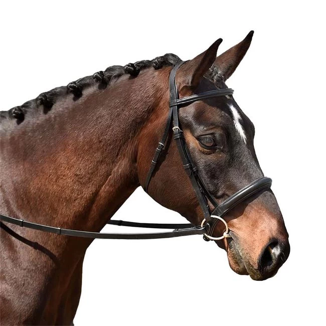 This deluxe dressage bridle is handcrafted in the finest English leather with raised details and a shaped, padded monocrown for added comfort through the poll. Buckle attachments on both sides of the throatlatch for adjustment ease. Comes with raised, laced leather reins. Combination buckle and hook stud closures. Nickel finish hardware. Imported.