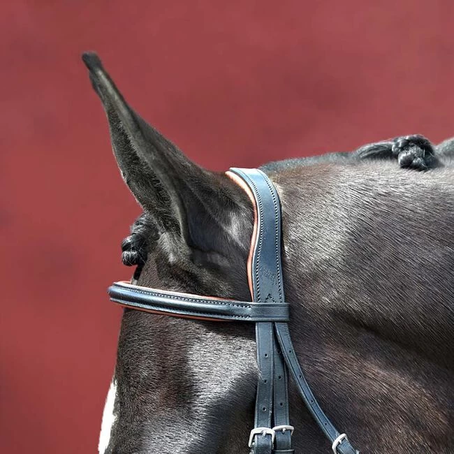 This handcrafted snaffle bridle features beautifully raised details on the browband and noseband and a pair of laced leather reins. Enhanced with contrasting chocolate brown padding at the crown, browband and noseband for added comfort. Removable flash. Premium quality leather with buckle ends for on/off ease. Nickel finish hardware. Imported.