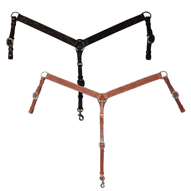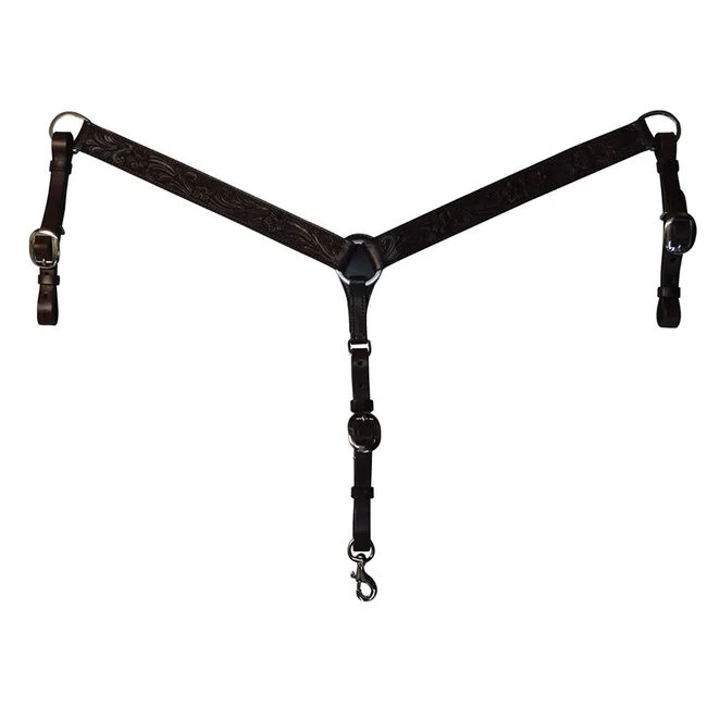 The Circle Y Straight Floral Breastcollar is a 1 1/2″ wide straight breast collar that is made from leather and features beautiful floral tooling. It is designed to be used with most saddles. The breast collar features double ply leather and stainless steel hardware for lasting durability and longer wear. Circle Y started handcrafting saddles in 1960, and today it continues to produce high-quality saddles and tack building on the heritage, traditions, and care the company was founded on.