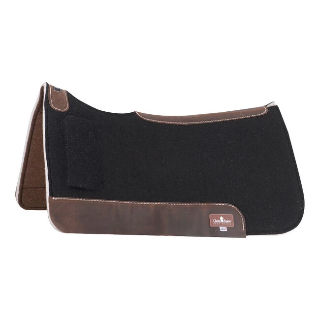 Thick orthopedic fleece center absorbs shock and disperses pressure. Premium grade felt bottom with shock absorbing wool felt center. Closed-cell foam shim is wedge-shaped to alleviate saddle fit issues. Contoured to fit the horse’s shape more closely. Alleviates “downhill” saddle fit due to atrophy or conformation issues at the withers. Adjustable correction; slide forward for less, slide back for more.