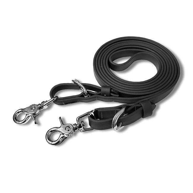 Dr. Cook’s Beta Trail Reins are made out of the highest quality 5/8” wide 8′ long Beta from Genuine BioThane USA . Made of one continuous piece of Beta so you never have to worry about dropping a rein while out on the trail. Sewn-on steel antiqued silver-tone swedge buckles complete with bit snaps so you can unsnap one side for easy leading.