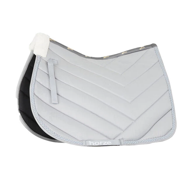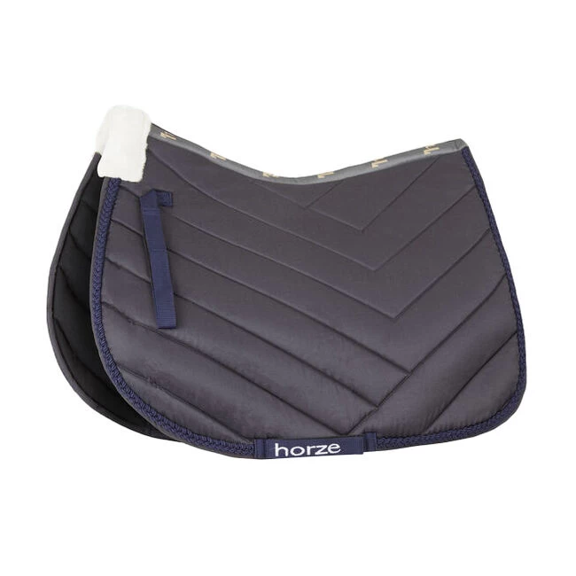 The Horze Victoria all purpose saddle pad is made from soft material with quick-dry lining that wicks away any moisture. Quilting in arrow shape adds a dynamic touch. Cosy faux fur at the withers provides comfort. Pretty braiding around the edges makes for a stunning look, and the logo tape along the spine gives a sporty vibe.