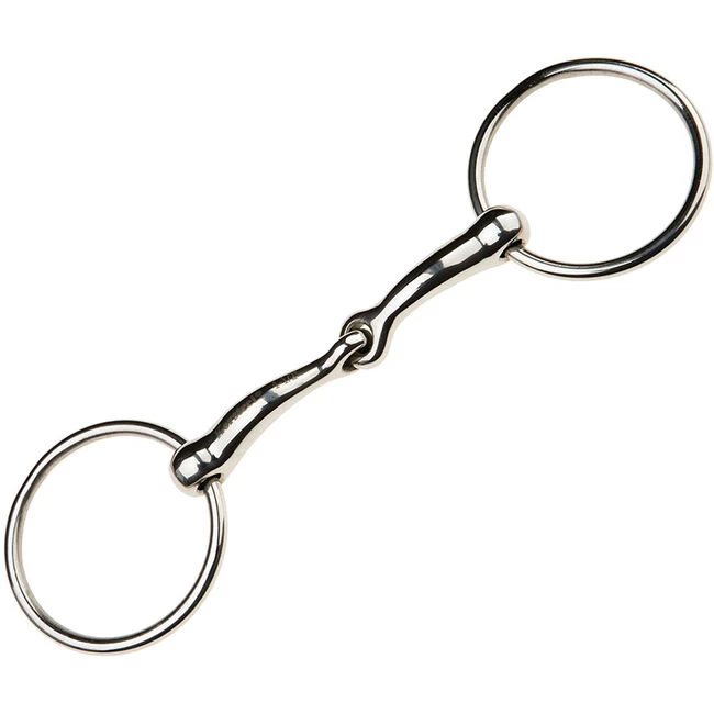 The JP loose ring snaffle is a nice bit for horses with a fairly large tongue or small mouth, being curved in the mouthpiece and not too thick in the bars. The curve of the mouthpiece reduces the action of the nutcracker, and helps to prevent the bit from contacting the palette.