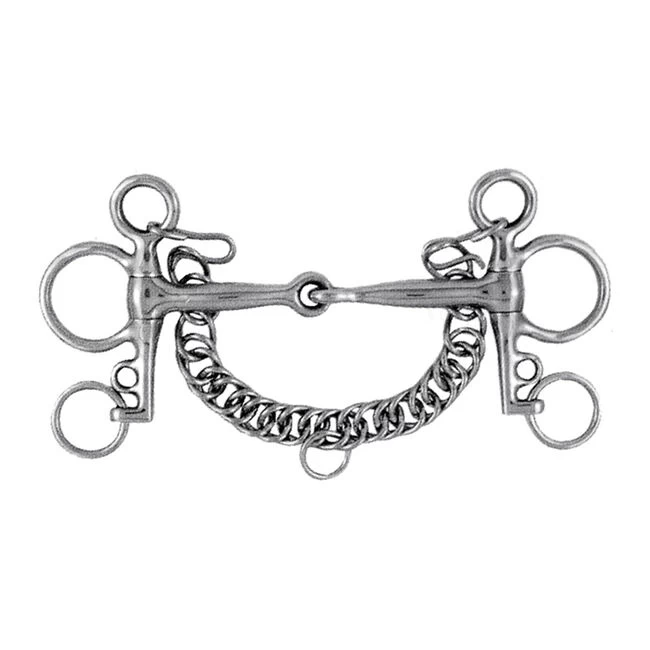 The Pelham bit combines the function of a snaffle and the action of a curb bit. The top rein provides snaffle pressure to the tongue and corners of the mouth, while the bottom rein increases leverage and curb chain pressure. The Tom Thumb cheeks are shorter than on a traditional pelham making this a better bit for a less experienced rider due to the reduced curb action available. The single joint applies a nut cracker action which applies pressure to the tongue, the bars of the mouth and the horse’s palate.