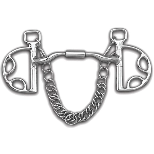 The MB 04 is similar to the MB 02 in that it will rotate on the tongue and apply tongue pressure, however, it has a small (¼”) port that introduces some tongue relief to the horse. The port allows the horse to swallow and move his tongue when he is moving forward and relaxed, which acts as a release or reward. The mouthpiece is curved, and it wraps around the bars and lips instead of pinching.