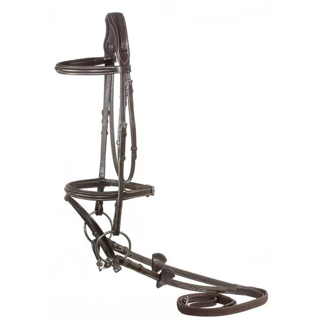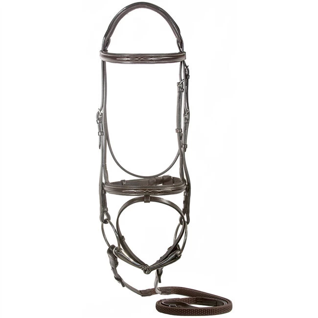 The Gianna Bridle has a sewn in flash cavesson and is part of the Nunn Finer® Argento Collection. Made from premium leather with a padded inlaid crown, The Gianna features matching fancy stitching on the padded and raised browband and cavesson as well as the soft grip reins that come with the bridle. The versatility of this bridle will ensure this becomes your everyday favorite bridle.