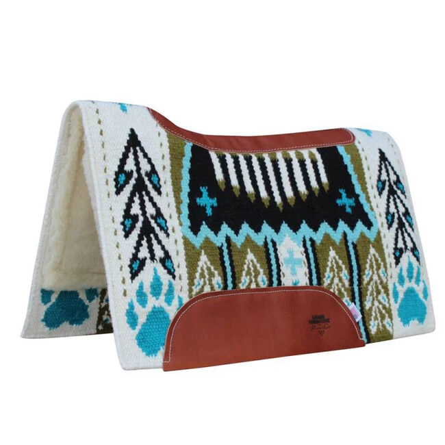 Bears represent protection, symbolize authority, physical strength and leadership. The bear paw/track symbol is a powerful good omen. The cross signifies direction and joining together. It also represents steadfastness. The saddle bag shape in the center of the blanket is symbolic of a long journey. Bear Paw protects and joins the horse and rider. It marks the pair with good things to come, direction and steadfastness in their journey to success.