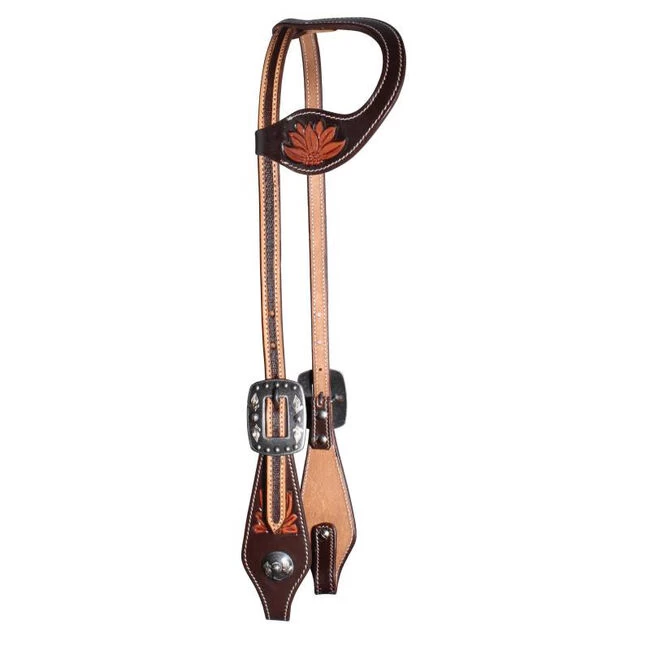 Pictures cannot do justice to the exclusive Professional’s Choice designed sunflower collection. Rich chocolate colored leather and natural tooling will be a standout on any horse. Headstall features sunflower motif, double adjustment buckles, and conchos. Stainless steel hardware.