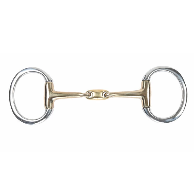 The fixed rings on this eggbutt bit help to prevent pinching, whilst the brass alloy double joint distributes pressure over both the tongue and bars of the mouth to encourage mouthing and contact.