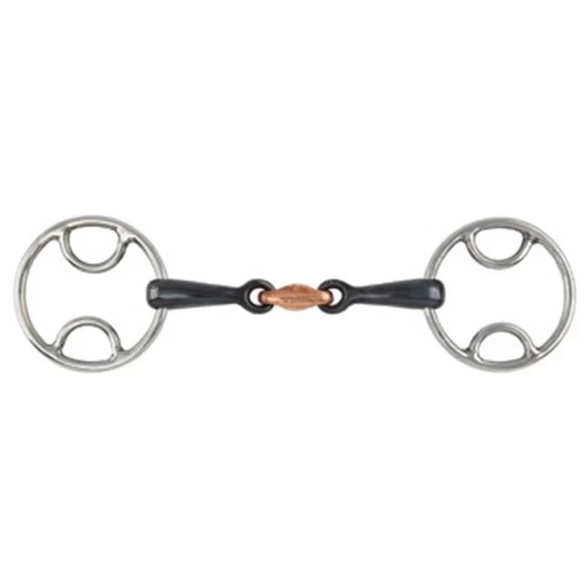 This bit allows mild leverage and helps with control. The sweet iron and copper mouthpiece aids salivation and acceptance of the bit. The ring is larger on the 5″ & 5.5″ so the bit remains in proportion with the larger horses head.