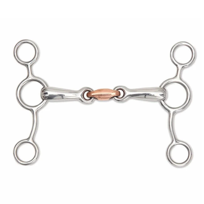The Shires Tom Thumb Bit with Copper Lozenge works by putting pressure on the poll and the tongue. Attaching the reins to the lower rings will increase severity. Should be used with care. Copper lozenge increases salivation and palatability.