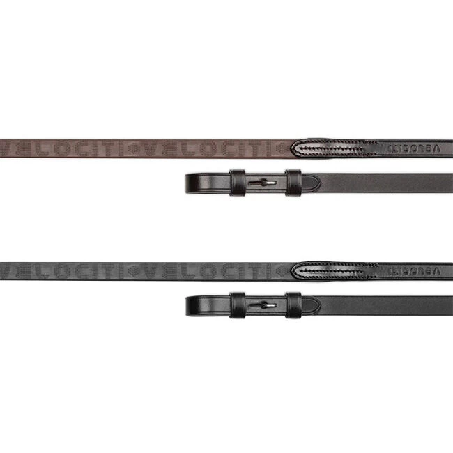 The Signature Velociti LUSSO reins are designed with anti-slip security, featuring elegantly textured rubber grips. The grips are reinforced with non-stretch nylon webbing for added strength and flexibility. The double layer bit ends are enhanced for durability. The Velociti Pro Series Luxe LUSSO bridlework is precision engineered for sensitivity and crafted from selected European leather for a supple and reliable finish. The bridlework features the latest design advancements and provides comfort for your horse. The harness hardware is made of high shine stainless steel, and the eco-friendly vegetable tanned polo leather is hand-stitched with self-colour thread. The reins are finished with a punched Velociti stamp and hook stud billets.