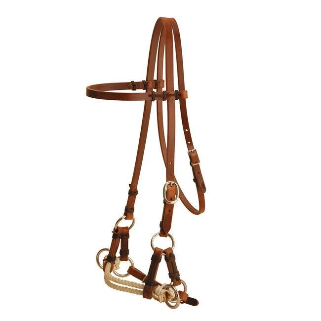 The Double Nose Side Pull is designed for starting a young horse. The contact on the nose gives control and the rein rings enable you to teach the horse to give his head.