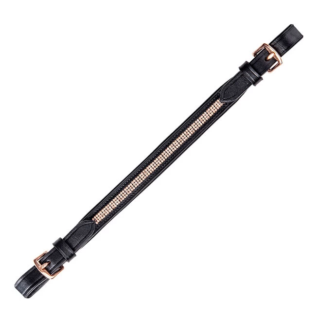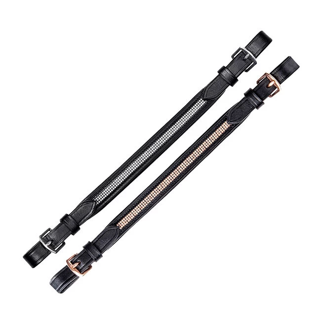 Hard-wearing leather, softly padded. Simply buckle onto the rings on the saddle. Inlaid with rhinestones.