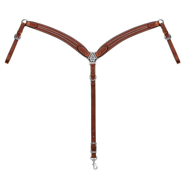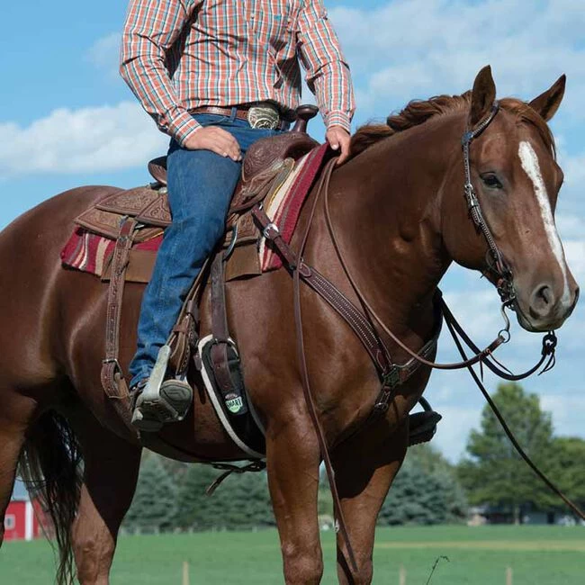 Offering a high end, showy look without a high price, this rich brown premium English bridle leather tack has a soft, smooth and refined feel. The beautiful variation of brown tones in this leather coordinates with medium oiled saddles for a put-together look. Horse Shoe Brand floral stainless steel hardware with black accents designed by custom saddlemaker Jeremiah Watt and etched nickel brass spots give this piece show ring-worthy appeal. Black chrome tanned laces at bit ends. Horse size. Handcrafted in the USA by Weaver Leather.