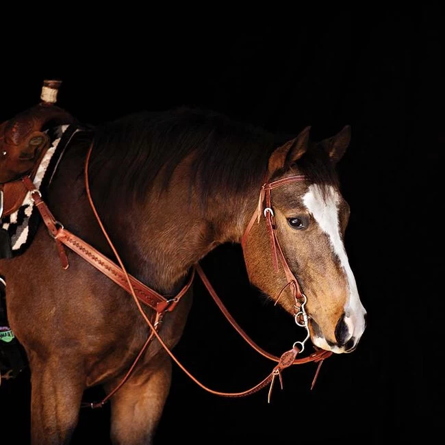 Hand tooled with a crisp, deep barbed wire pattern, this brown skirting leather breast collar is perfect for trail and recreational riding as well as a day at the ranch. The beauty and reliability of this design make it a timeless classic. Width tapers from 1-3/4″ to 1-1/4″. Features a center ring with leather backer, a tie down dee and adjustable center strap. Stainless steel hardware.
