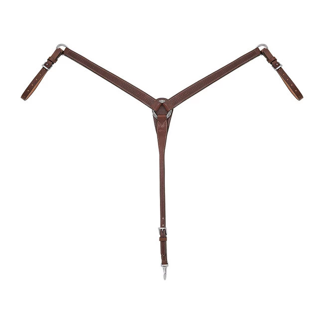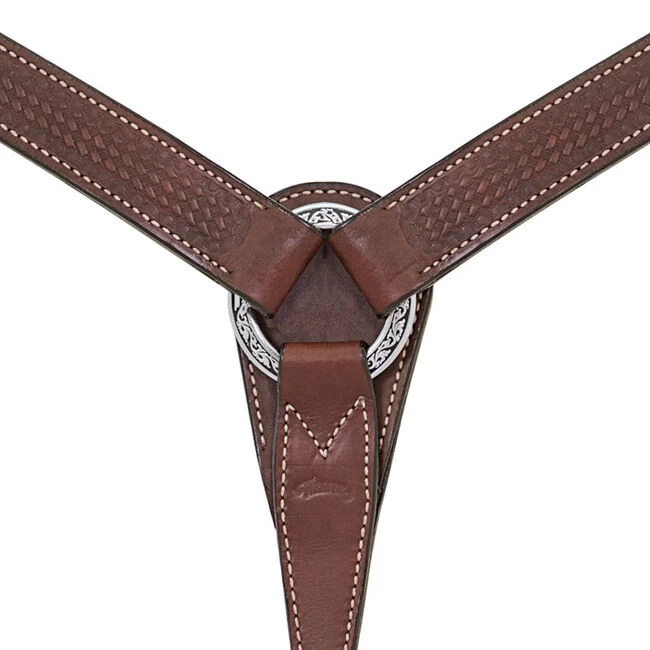 From the vaqueros of yesteryear to the working cowboys of today, there has always been a heritage of fine horsemanship in the Great Basin region. Weaver is paying homage to these skilled cowboys in the details and care put into this line of tack. This premium English bridle leather tapered breast collar features an intricate stamped basketweave design, wheat-colored stitching and painted leather edges. Width tapers from 1-1/2″ to 1″. Stainless steel hardware. Horse size. Made by Weaver.