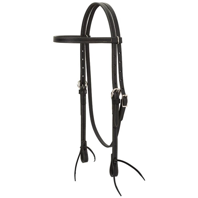 Crafted from single-ply 5/8″ 100% natural vegetable tanned hot stuffed leather in a classic black color, this headstall has a doubled and stitched browband and chicago screw bit ends. Durable nickel plated hardware. Horse size.