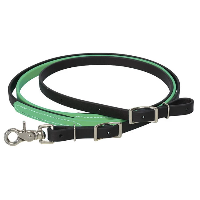 All purpose rein offers the easy cleaning, weather resistance and durability of our exclusive Brahma Webb® coated webbing in a versatile design perfect for a wide range of riders. Brightly-colored Brahma Webb® is accented with black Brahma Webb® and conway buckles at the bit ends. Scissor snap on one end. Length: 8 feet. Non-rust stainless steel hardware.