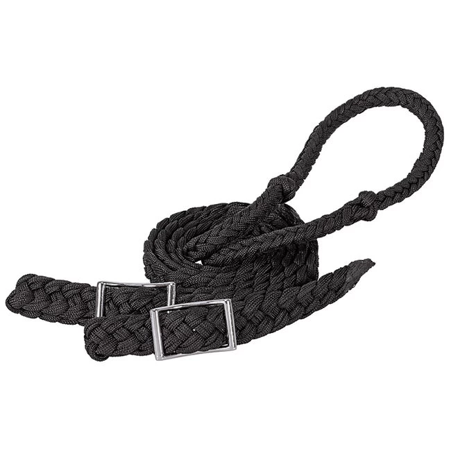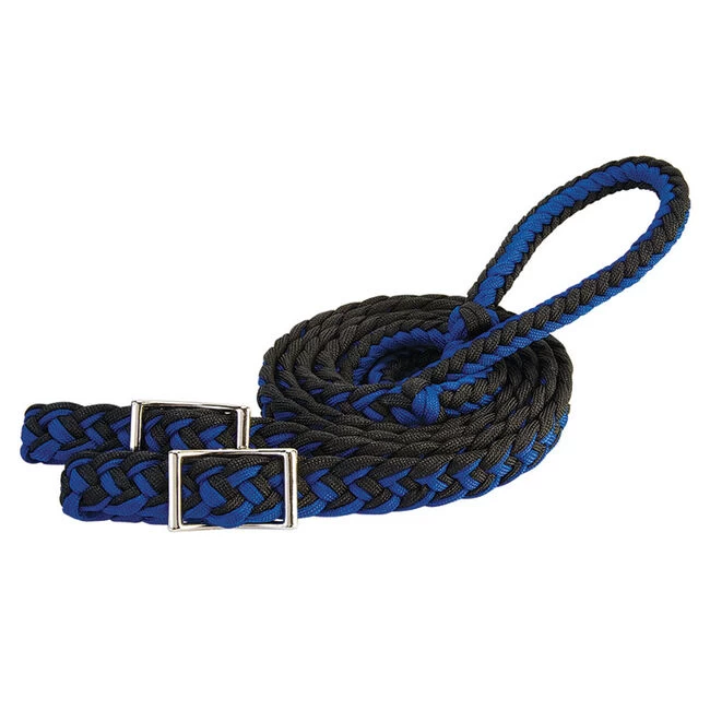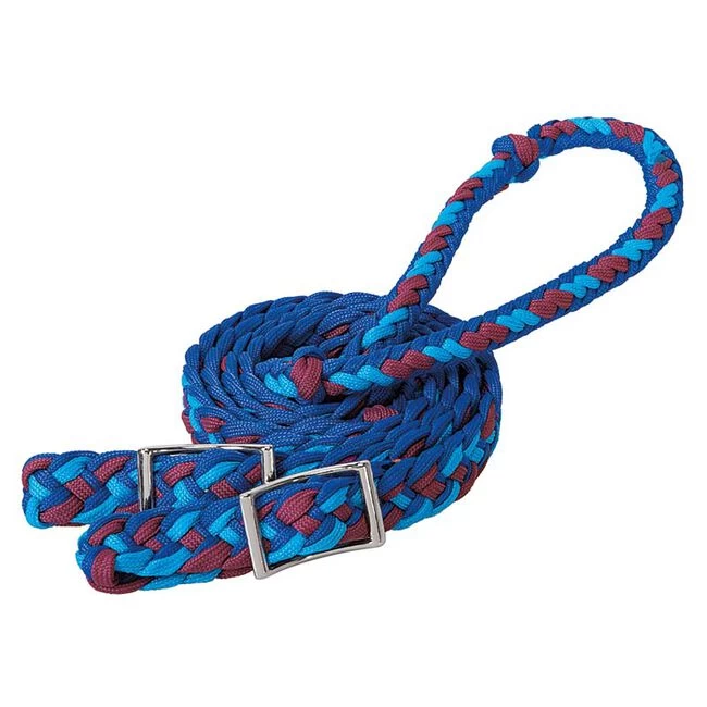 These 1″ flat end braided nylon barrel reins feature easy grip knots for a secure feel in the hands. Nickel plated conway buckle bit ends. Measure 1/2″ x 8′ (1″ wide 32″ back from bit ends).