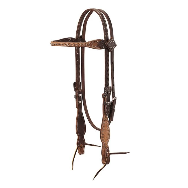 Rough out oiled canyon rose harness leather gives this browband headstall adorned with matte pewter spots the perfect touch of western style. Weaver Leather exclusive buffed brown hardware with squared design has an aged patina for an antiqued look. Details like a slim 1/2″ browband adorned with conchos and a scalloped cheek design add extra on-trend style that will look great on your horse. Leather ties at bit ends for easy bit changes. Horse size.