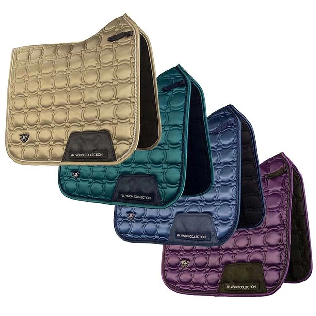 The Vision Collection from Woof Wear combines luxurious satin fabrics embroidered with designs inspired by Southern European Artisans. Whilst the inspiration is timeless, the technology is 21st Century using breathable meshes and wicking fabrics to ensure Horse comfort. Woof Wear’s Vision Dressage Pad has a High Wither Design and has been shaped to fit both the contours of the horse and modern saddles.